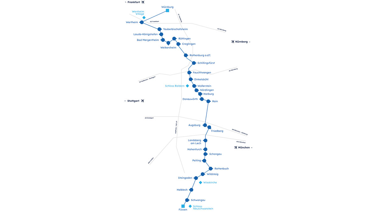 Von Würzburg in Unterfranken im Norden über Tauberbischofsheim, Dinkelsbühl, Nördlingen, Donauwörth und Landsberg am Lech bis nach Füssen ganz im Süden Deutschlands an der Grenze zu Österreich verbindet der Reiseweg insgesamt 29 Orte, die die Besucher auf unterschiedlich langen Streckenverläufen entweder mit dem Auto (460 Kilometer) beziehungsweise dem Fahrrad oder zu Fuß (jeweils knapp 500 Kilometer) bereisen können.