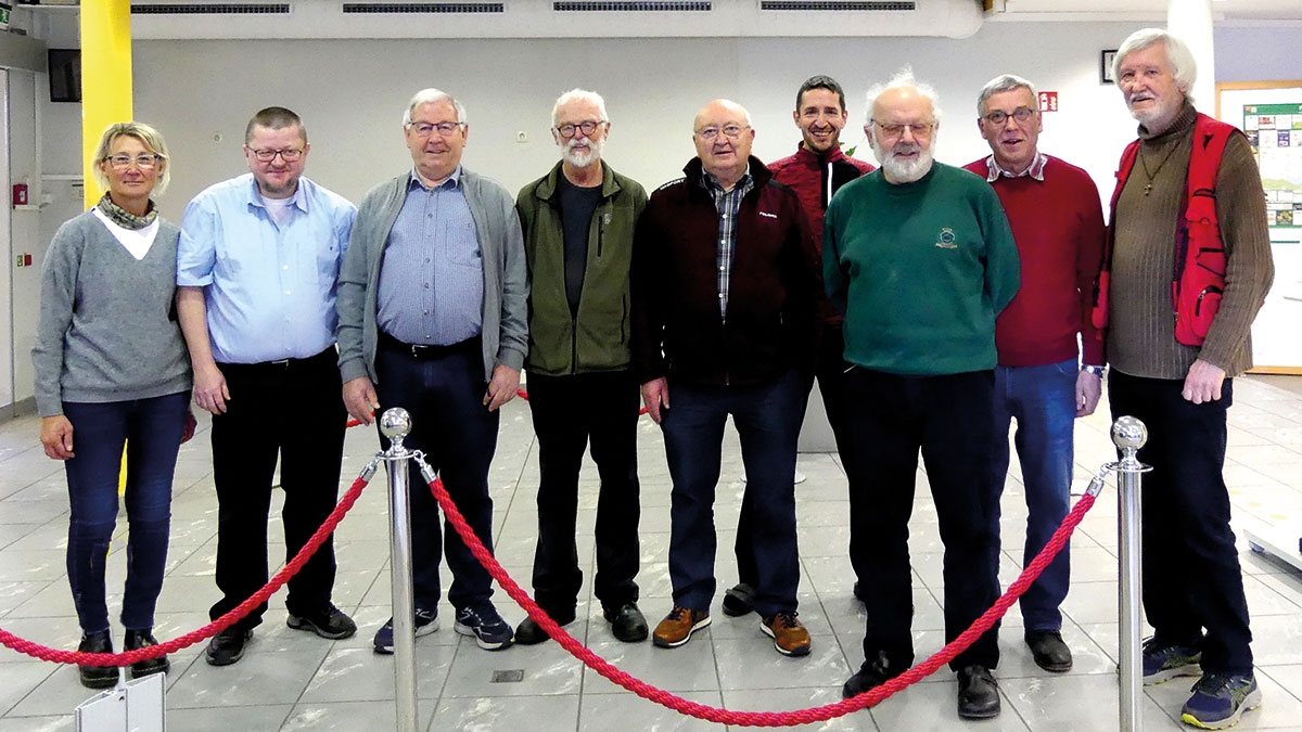 Die beiden Aktiven Werner Bechtold, 2. von links und Günther Schreyer, 4. von rechts, hatten am 29. Januar dort ihren letzten Arbeitstag und freuten sich über die überraschenden Besucher, denn sie hatten beide noch mit einigen von den Pensionären in den zurückliegenden Jahren persönlich zusammengearbeitet.