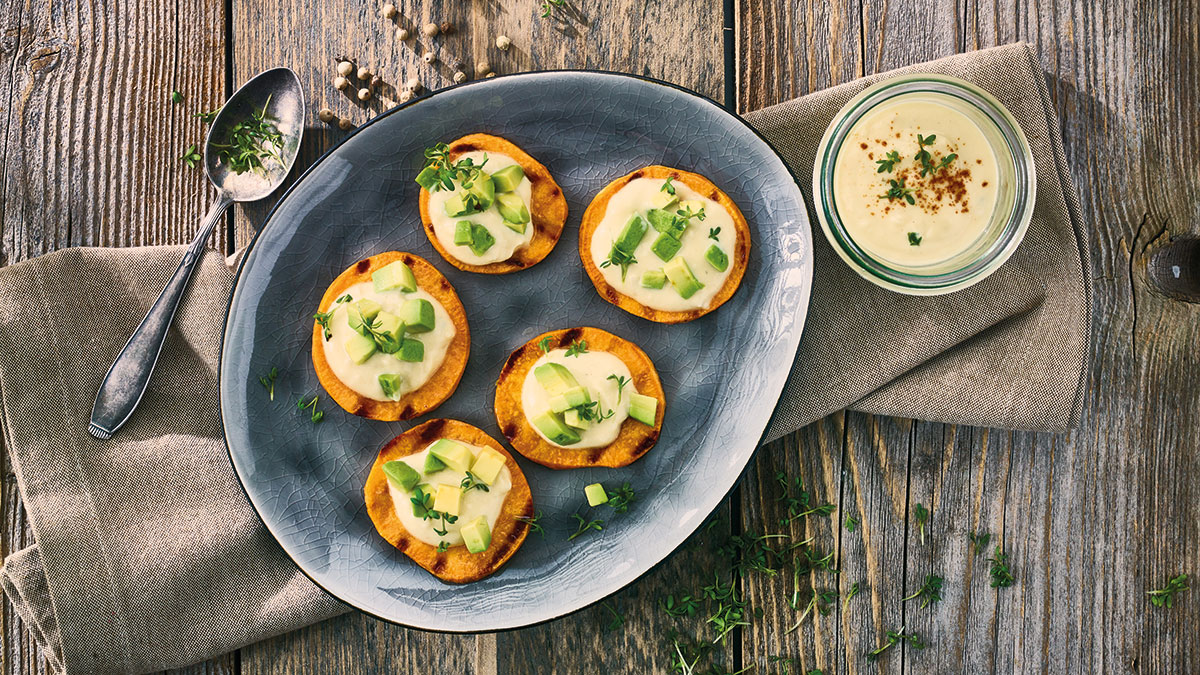 Diese Süßkartoffeln vom Grill mit einem veganen Dip und Avocadostückchen sind ein Hit auf jeder Grillparty.