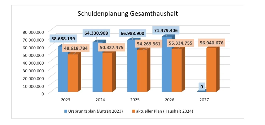 Zur Einordnung: Auf Grundlage der Haushaltsplanung aus dem Jahr 2019 war ursprünglich eine Verschuldung von rund 67 Millionen Euro zum 31. Dezember 2025 prognostiziert worden. Tatsächlich beträgt der Schuldenstand zum 31. Dezember 2025 nach vorläufigen Zahlen 23,9 Millionen Euro.