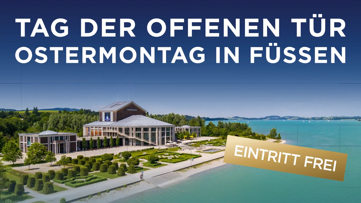 Am Ostermontag, 6. April 2026, öffnet das Festspielhaus Neuschwanstein Füssen von 10 bis 17 Uhr seine Türen für Besucher. Der Eintritt ist frei. Das Programm richtet sich an Familien, Musical-Interessierte und alle, die einen Blick hinter die Kulissen des Theaters werfen möchten.