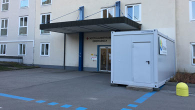 Der Container vor dem Eingang zum Notfallzentrum am Krankenhaus in Füssen steht seit heute. Auf der einen Seite prangt das…