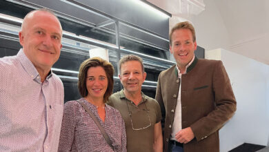 Markthallen-Verwalter Markus Krug (links im Bild) freut sich gemeinsam mit Jeanette Kästner (Stadtverwaltung Füssen) sowie Bürgermeister Maximilian Eichstetter (rechts) über…