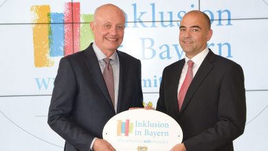 ‚Inklusion in Bayern – wir arbeiten miteinander!‘ – dieses Emblem hat der Amtschef im Bayerischen Sozialministerium, Ministerialdirektor Michael Höhenberger dem…