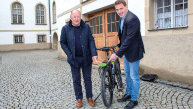 Karlheinz Waschetzko (links) hat kürzlich Bürgermeister Maximilian Eichstetter seine Job-Radler-Plakette vorgestellt. Waschetzko möchte mit der Plakette Menschen, die mit dem…